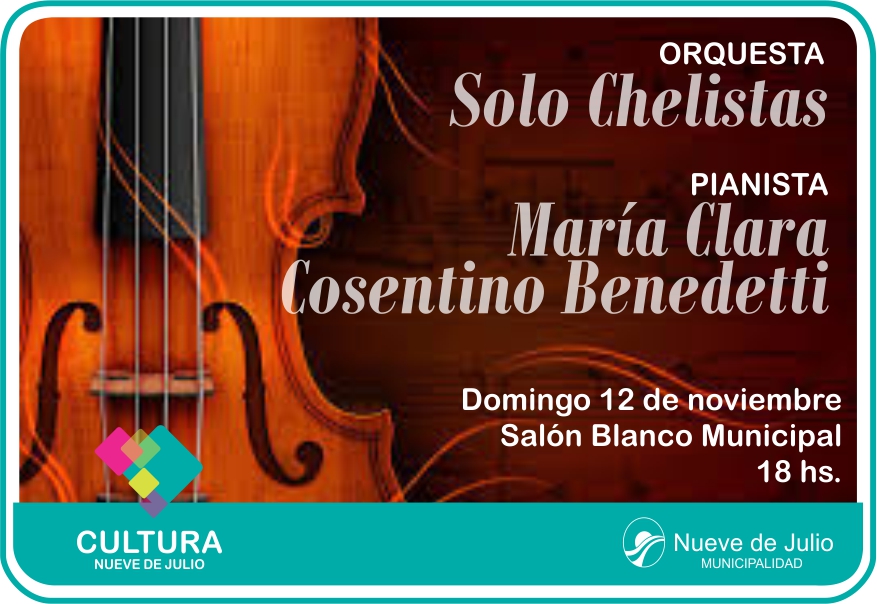 En tanto, el domingo 12, a partir de las 18 hs. en el Salón Blanco del Palacio Municipal, nuevamente se presentarán “Somos Chelistas” y la pianista María Clara Cosentino Benedetti.