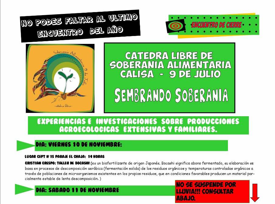 El sábado 11 de noviembre de 14 a 18 hs, se realizará en el CEPT N°15 Pje ”El Chajá”, el cuarto encuentro de la Cátedra Libre de Soberanía Alimentaria, y tendrá a la Agroecología como eje.