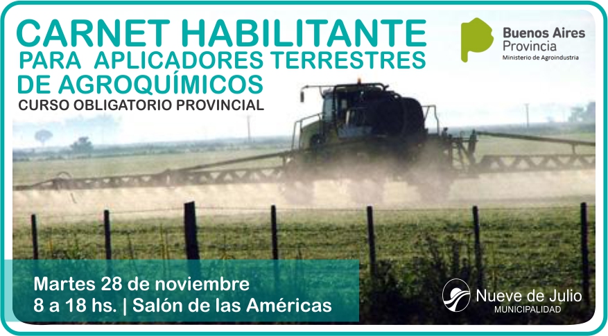 A través de la Dirección de Gestión Ambiental de la Municipalidad de Nueve de Julio, el martes 28 de noviembre, se llevará a cabo una jornada de capacitación obligatoria para aplicadores terrestres en actividad.