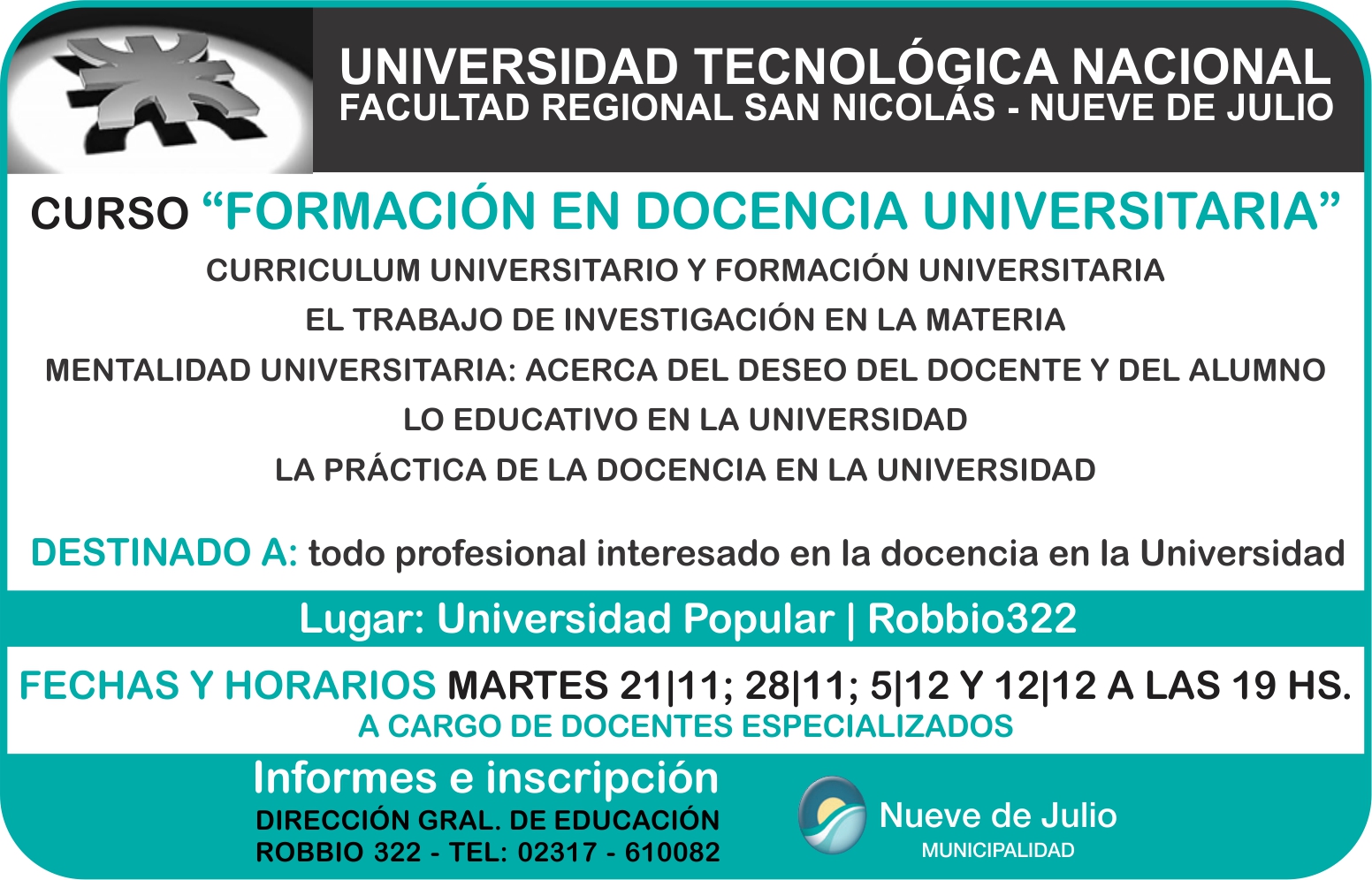 A través de la Dirección de Educación de la Municipalidad de Nueve de Julio, desde el próximo martes 22, y continuando los días 28/11, y 5 y 12/12, en el horario de las 19 hs., se habrá de dictar en la Universidad Popular de calle Robbio 322, un importante curso sobre formación en docencia universitaria, dictado por profesores de la sede San Nicolás de la Universidad Tecnológica Nacional y destinado a todo profesional interesado en docencia universitaria.