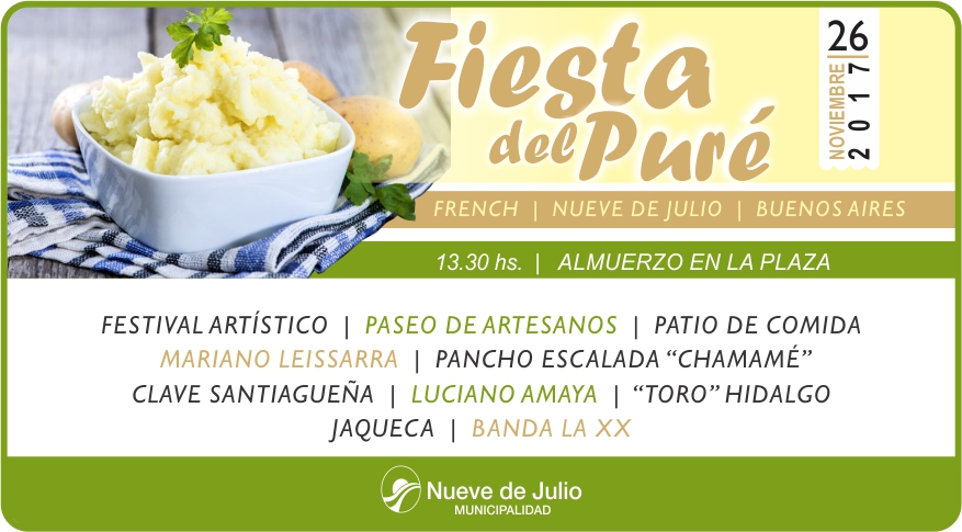 Entre el próximo viernes 24 y el domingo 26, la comunidad de French habrá de celebrar el 130 aniversario de su fundación, con una serie de importantes actos que enmarcarán la 10ma. edición de la Fiesta del Puré, evento que cuenta con el auspicio de la Municipalidad de Nueve de Julio.