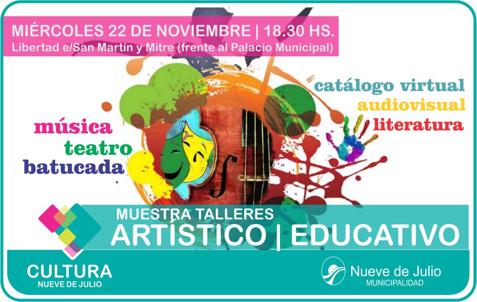 A través de la Dirección de Cultura de la Municipalidad de Nueve de Julio, mañana, miércoles 22 de noviembre, a las 18,30 hs., y frente al Palacio Municipal, se realizará una atractiva muestra de talleres artísticos y educativos, los que abarcan las disciplinas de música, teatro, batucada, catálogo virtual, audiovisual y literatura; en una actividad abierta a toda la comunidad.