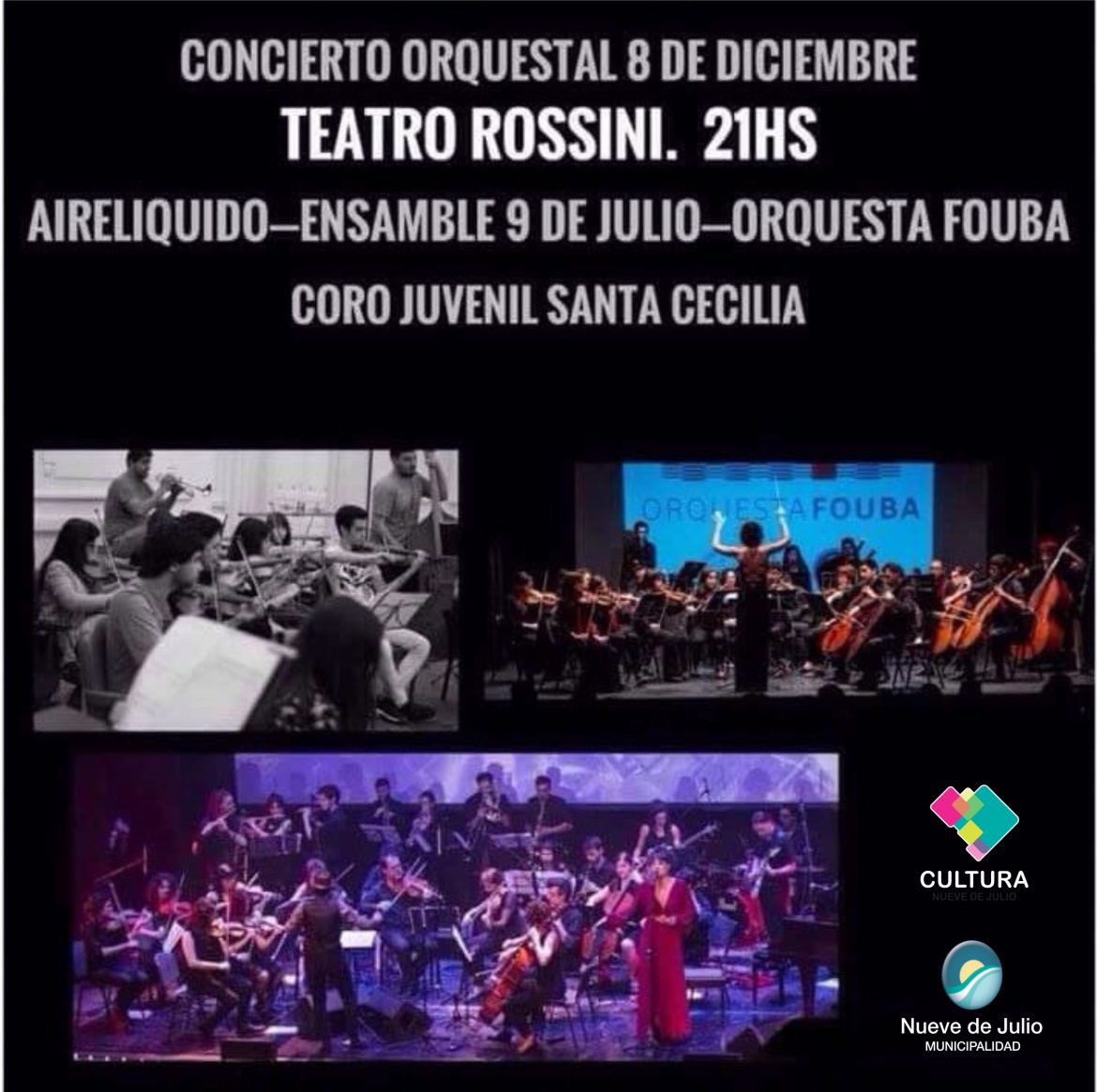 Con el auspicio de la Dirección de Cultura de la Municipalidad de Nueve de julio, el próximo viernes 8 de diciembre, desde las 21 hs., y en el Teatro Rossini, se presentará un gran concierto orquestal de fin de año, en el que se presentarán Aire Líquido, Ensamble 9 de Julio, Orquesta FOUBA y el Coro Juvenil Municipal Santa Cecilia.