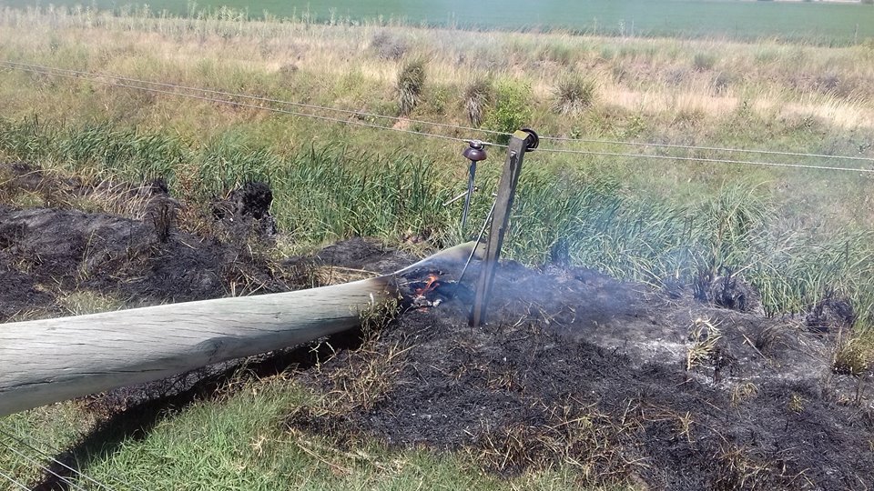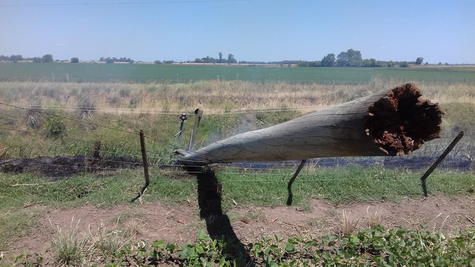 Concurren 2 dotaciones de Bomberos Voluntarios. Al arribar al lugar se observa que el mismo se inició por la caída de un poste que conduce 13.200 W de energía eléctrica, por lo que solicita se interrumpa la sección desde Carlos María Naón.