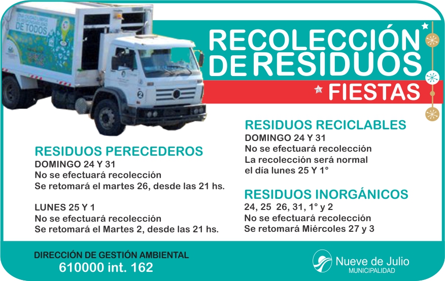 La Municipalidad de Nueve de Julio informa el cronograma a aplicar en lo que hace a la recolección de residuos, ante la celebración de la Nochebuena y la Navidad, cuyo cumplimiento por parte de todos los vecinos será de fundamental importancia para mantener una ciudad limpia.