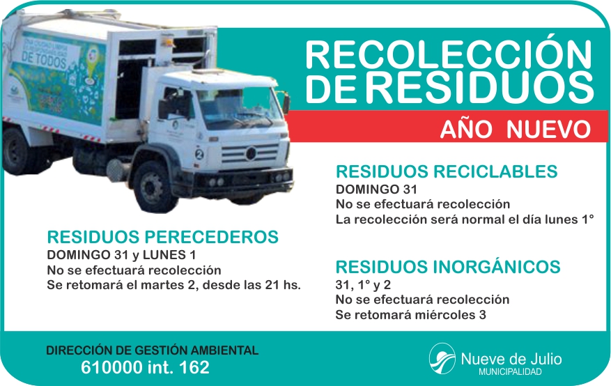La Municipalidad de Nueve de Julio informa el cronograma a aplicar en lo que hace a la recolección de residuos, ante la celebración del Año nuevo, cuyo cumplimiento por parte de todos los vecinos será de fundamental importancia para mantener una ciudad limpia.