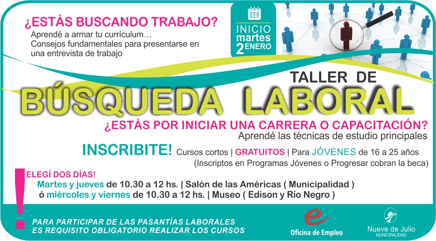 La Oficina de Empleo de la Municipalidad de Nueve de Julio, dictará, desde el martes 2 de enero de 2018 un interesante Taller de Búsqueda Laboral, totalmente gratuito, y destinado a jóvenes de 16 a 25 años de edad que deseen aprender a armar su currículum, con consejos fundamentales para presentarse en una entrevista de trabajo; y a quienes se encuentren a punto de iniciar una carrera o capacitación, aprendiendo a desarrollar las técnicas de estudio principales.