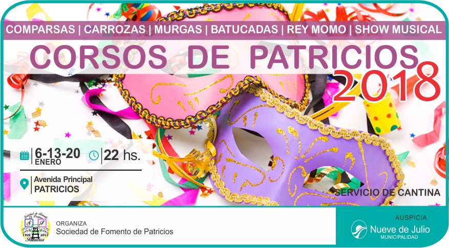 Con un interesante programa, la vecina localidad de Patricios iniciará el 2018 a puro ritmo con sus tradicionales Corsos, previstos para las noches de los sábados 6, 13 y 20 de enero; con carrozas, murgas, disfraces y el Rey Momo, que desfilarán por la avenida principal, en las mencionadas noches y a partir de las 22 hs., con la organización de la Sociedad de Fomento de la localidad y el auspicio de la Municipalidad de Nueve de Julio.