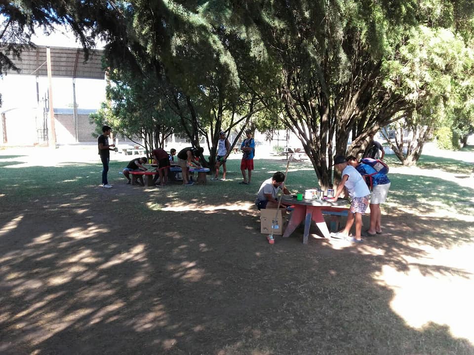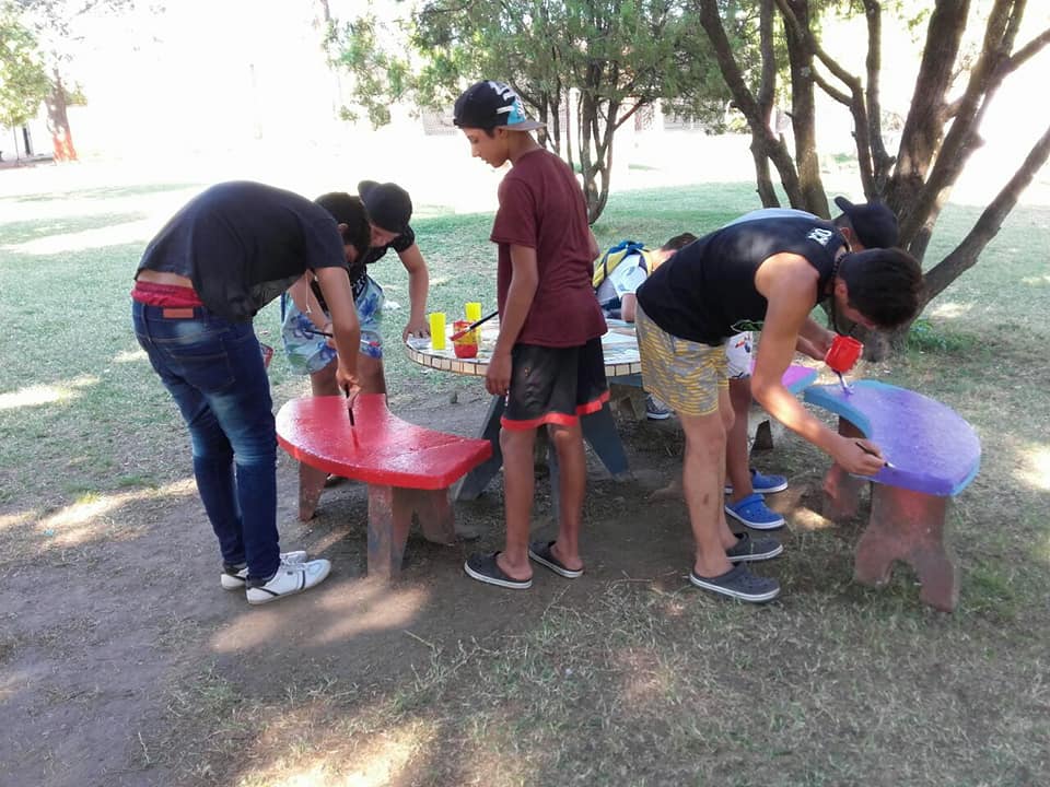 Los jóvenes que asisten al taller de Plástica del programa Envión pintaron los bancos del Club Libertad.