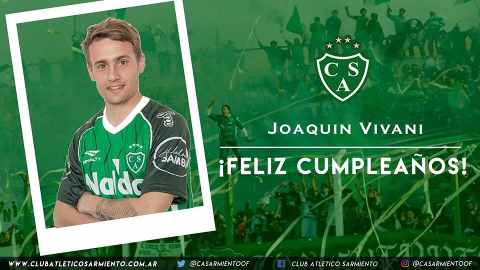 El juvenil futbolista que integra el plantel del Club Sarmiento de Junín, Joaquín Vivani, oriundo de nuestra ciudad y que hizo las inferiores hasta séptima división en Boca Juniors. Cumplió hoy sus flamantes 23 años, por tal motivo el Club Juninense le dedico un Flyer que se publicó en todas las redes sociales oficiales de la institución.