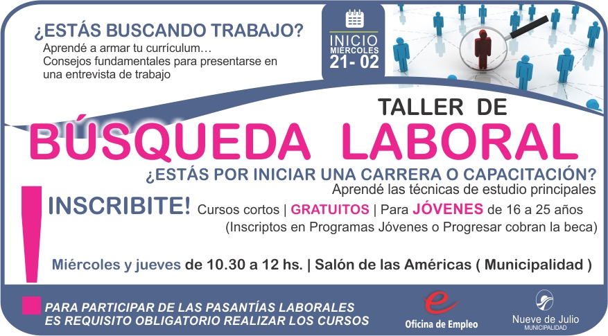 La Oficina de Empleo de la Municipalidad de Nueve de Julio, dictará, un interesante Taller de Búsqueda Laboral, totalmente gratuito, y destinado a jóvenes de 16 a 25 años de edad que deseen aprender a armar su currículum, con consejos fundamentales para presentarse en una entrevista de trabajo; y a quienes se encuentren a punto de iniciar una carrera o capacitación, aprendiendo a desarrollar las técnicas de estudio principales.