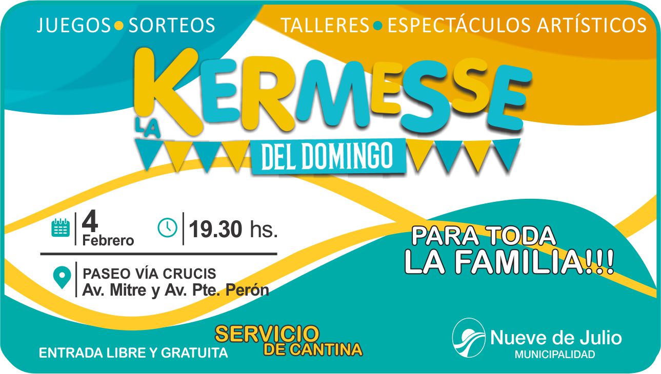 Luego de su exitoso inicio, el pasado domingo 28, en la localidad de 12 de Octubre, las kermesses organizadas por la Secretaría de Cultura, Educación y Turismo de la Municipalidad de Nueve de Julio, tendrán su continuidad este próximo domingo 4 de febrero en el Paseo del Vía Crucis (Avda. Mitre y Avda. Presidente Perón), desde las 19,30 hs.