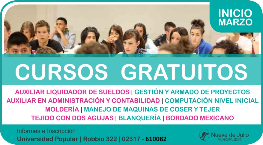Los interesados pueden obtener mayor información en la Universidad Popular, de Robbio 322, o a través del teléfono 02317-610082.