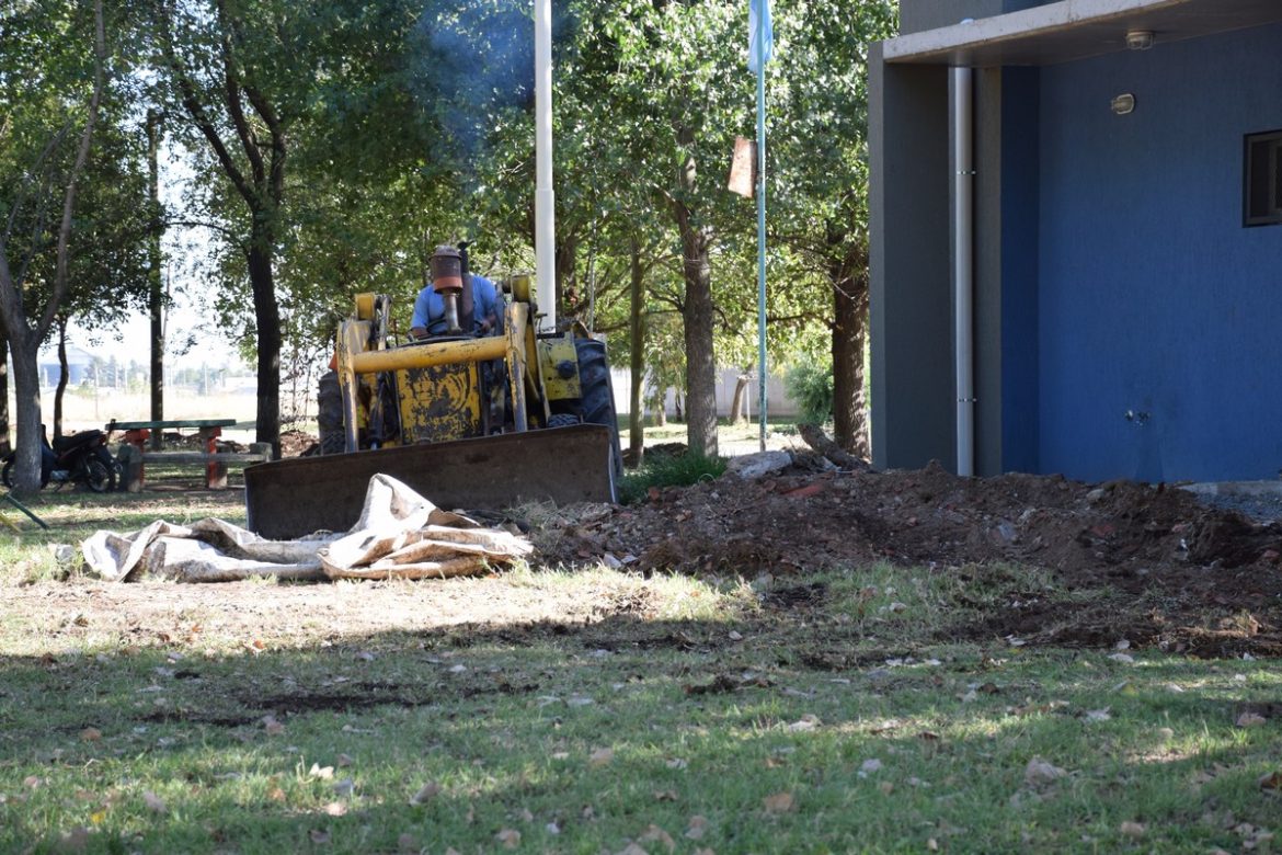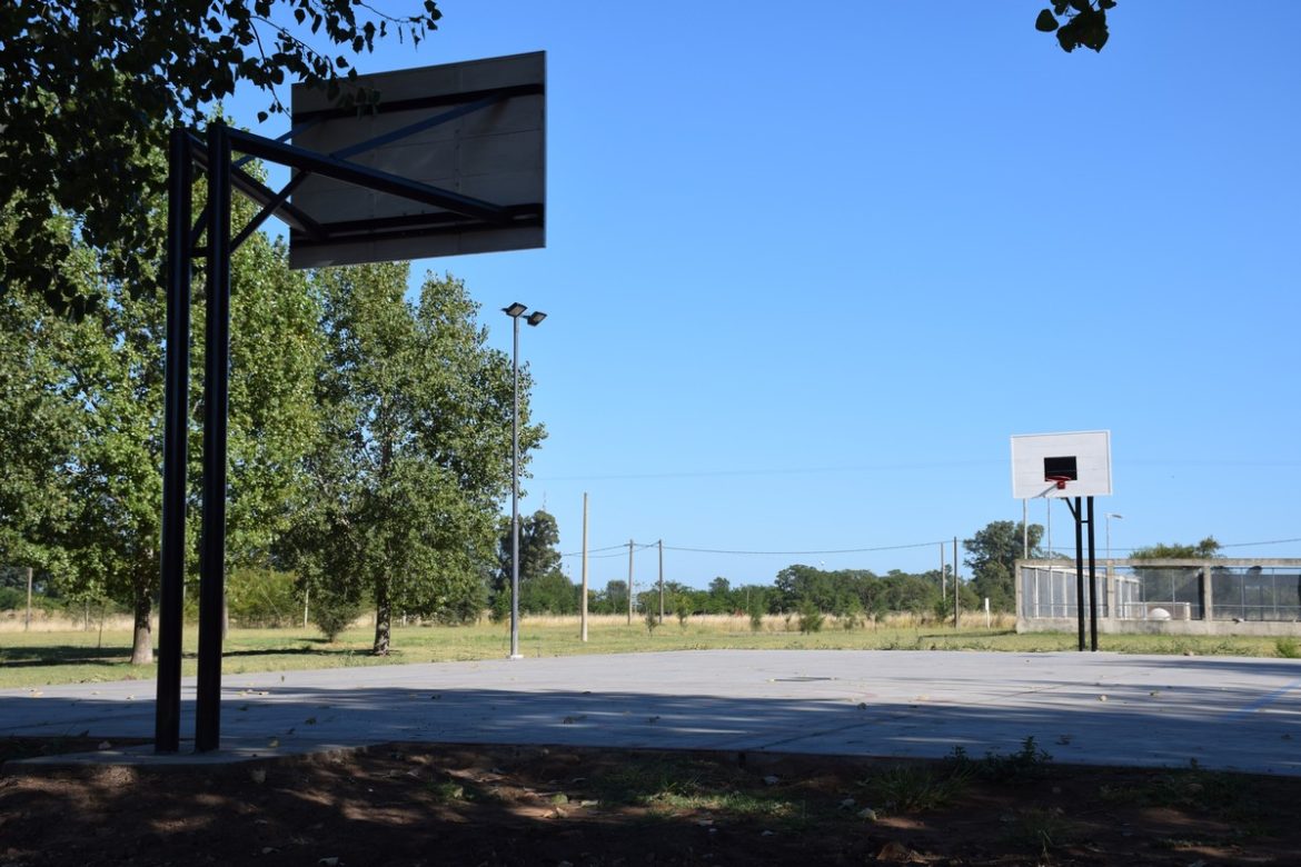 Tras los trabajos finales en el edificio soporte de 101 m2, y el hormigonado del playón de 405 m2, donde ya fueron colocados los aros de básquet, se trabaja en la parquización del espacio verde, para su próxima inauguración.