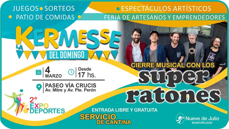 Se acerca el gran cierre artístico-cultural y musical del proyecto “La Kermesse del Domingo”. El próximo domingo 4 de marzo a partir de las 17 hs. en el Paseo del Vía Crucis (Av. Mitre y Av. Pte. Perón), donde se prodrá disfrutar de una jornada completa de espectáculos en vivo, feria de emprendedores y artesanos, 2da. Expo Deportes, con entrada libre y gratuita y servicio de cantina.