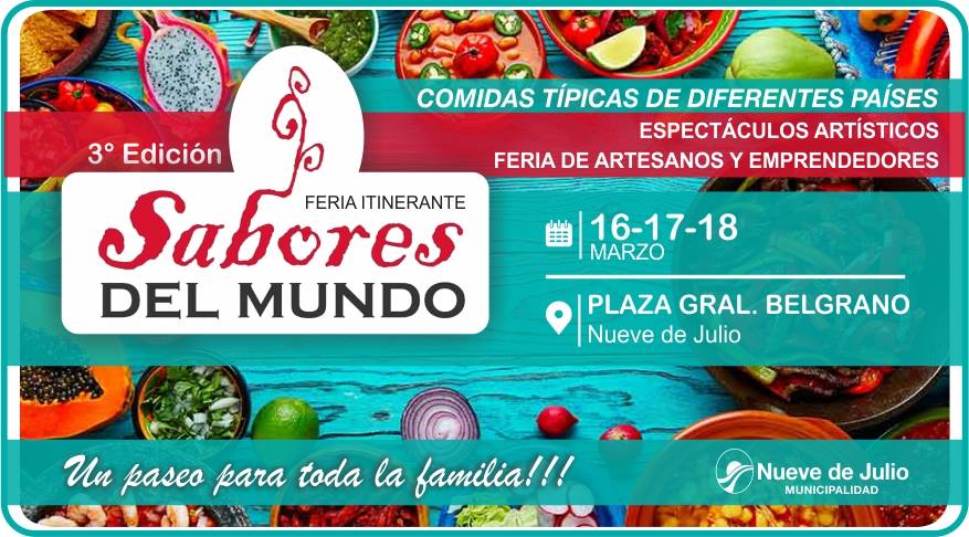 La Municipalidad de Nueve de Julio, a través de la Secretaría de Cultura, Educación y Deportes, llevará adelante entre los días 16, 17 y 18 de marzo próximo, y en Plaza Belgrano, la Feria “Sabores del Mundo”, surgida hace siete años es una feria itinerante que se ha convertido en una verdadera fiesta popular, con notable respuesta de público en cada una de sus presentaciones, con una original muestra de gastronomía de distintas regiones, que se completará con artesanos y presentaciones musicales.