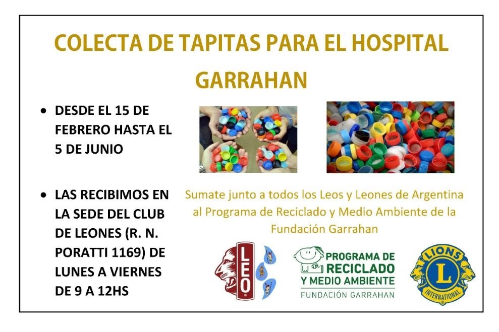 Desde el pasado 5 de febrero y hasta el 15 de junio próximo, el Club de Leones de 9 de Julio llevará adelante una campaña de recolección de tapitas con destino al Hospital Garrahan y su campaña de reciclado y cuidado del medio ambiente.