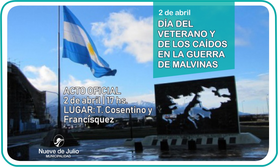 Al conmemorarse el próximo lunes 2 de abril el Día del Veterano y los Caídos en la Guerra de Malvinas, la Municipalidad de Nueve de Julio desarrollará los actos oficiales en esa misma jornada a partir de las 17 hs., y en la intersección de Av. Tomas Cosentino y Soldado Francísquez.