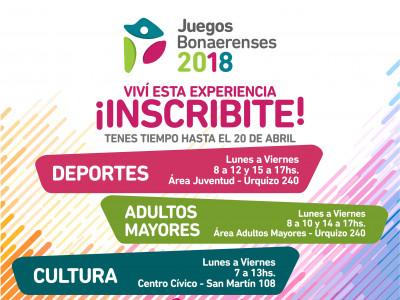 Los Juegos Bonaerenses se pondrán en marcha una vez más. Al igual que en el 2017 se contará con una Etapa Local, seguida de una Etapa Regional para luego, y ya en el mes de octubre, completar su calendario con el desarrollo de la Etapa Final en Mar del Plata. Las nuevas disciplinas deportivas y actividades culturales que ofrece esta edición, tienen como objetivo principal incluir e integrar a los jóvenes, a los adultos mayores y a las personas con discapacidad pertenecientes a los 135 municipios de la Provincia de Buenos Aires, en la práctica del deporte y la cultura a través de una sana competencia.