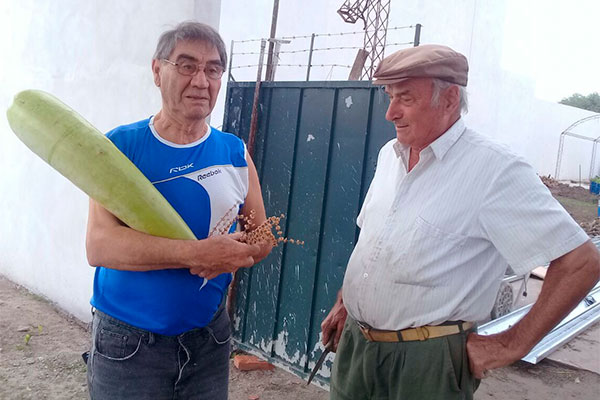 El convecino Antonio Mendive cosechó en su huerta una “súper-berenjena” de 2,900 kgrs. y 65 cm. de longitud que resultó realmente asombrosa. En la fotografía, Mendive con su amigo Abel Saavedra, sosteniendo la berenjena.
