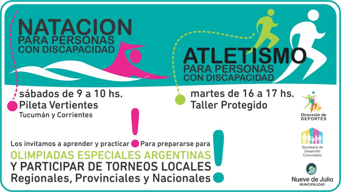 La Municipalidad de Nueve de Julio, a través de la Dirección de Deportes informa que continúa abierta la inscripción para las actividades de natación y atletismo para personas con discapacidad.