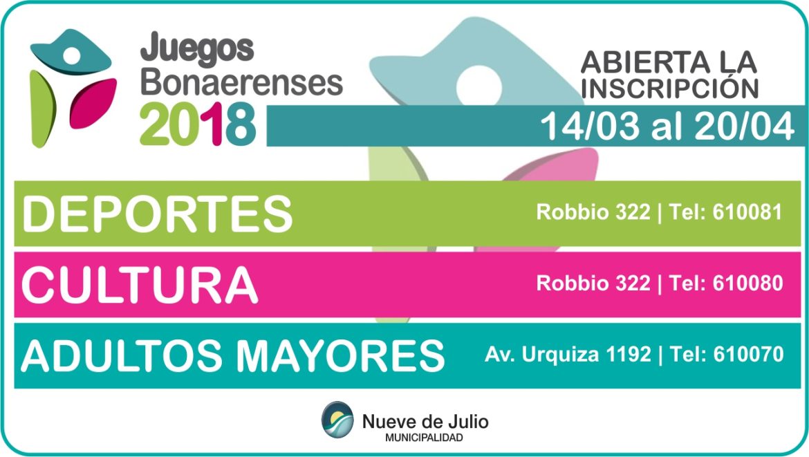 La Secretaría de Cultura, Educación y Deportes de la Municipalidad de Nueve de Julio informa que ya se encuentra abierta la inscripción para las competencias provinciales de los Juegos Bonaerenses 2018.