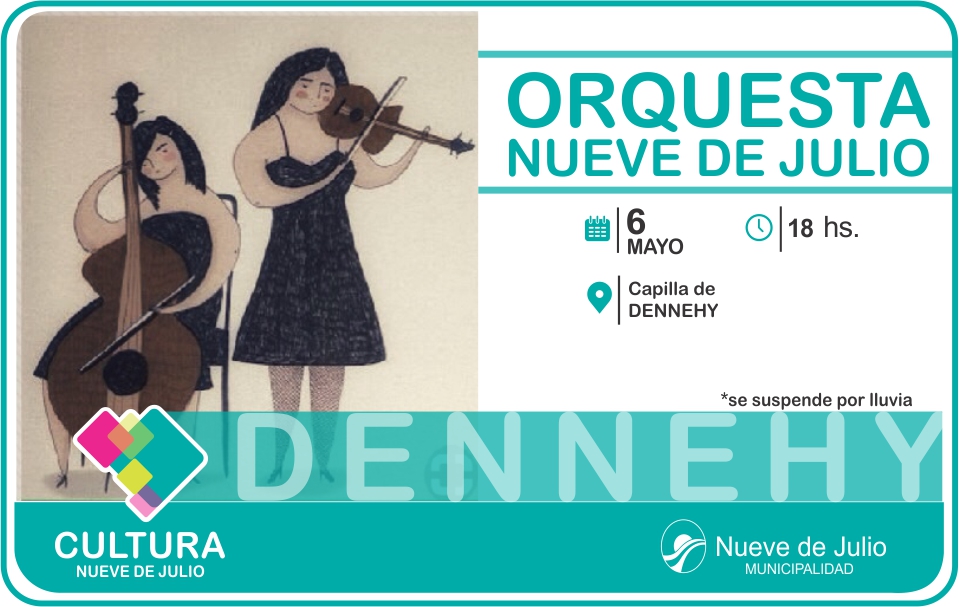 El domingo 6 de mayo, la Orquesta Nueve de Julio, realizará su presentación en la Capilla “Nuestra Señora del Carmen”, de la localidad de Dennehy, desde las 18 hs., en un especial concierto abierto a la comunidad en general.