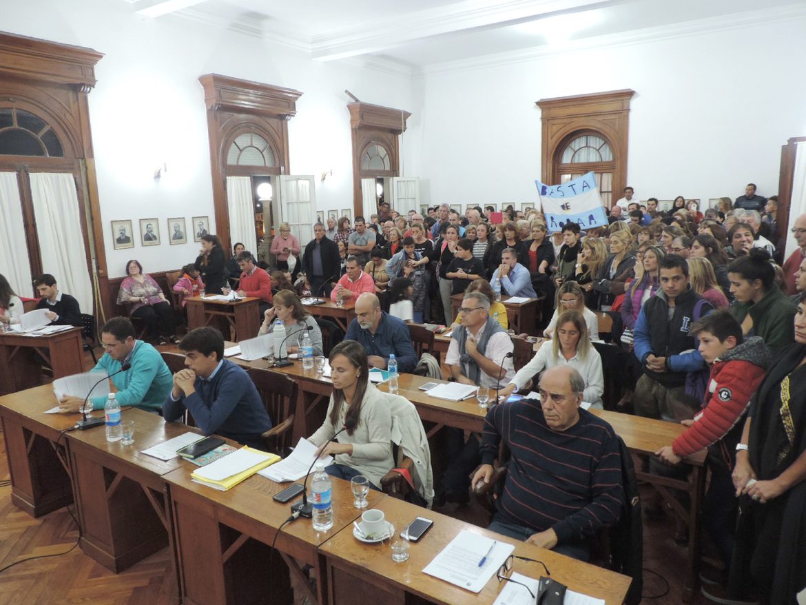 La sala, el pasillo y las escaleras del primer piso del Palacio Municipal se vieron colmadas, al tiempo que otro grupo esperó en Plaza Belgrano el desarrollo de los acontecimientos, donde no faltaron reclamos y fuertes epítetos contra autoridades municipales y de la CEyS Mariano Moreno, lo que demoró el inicio de la sesión.