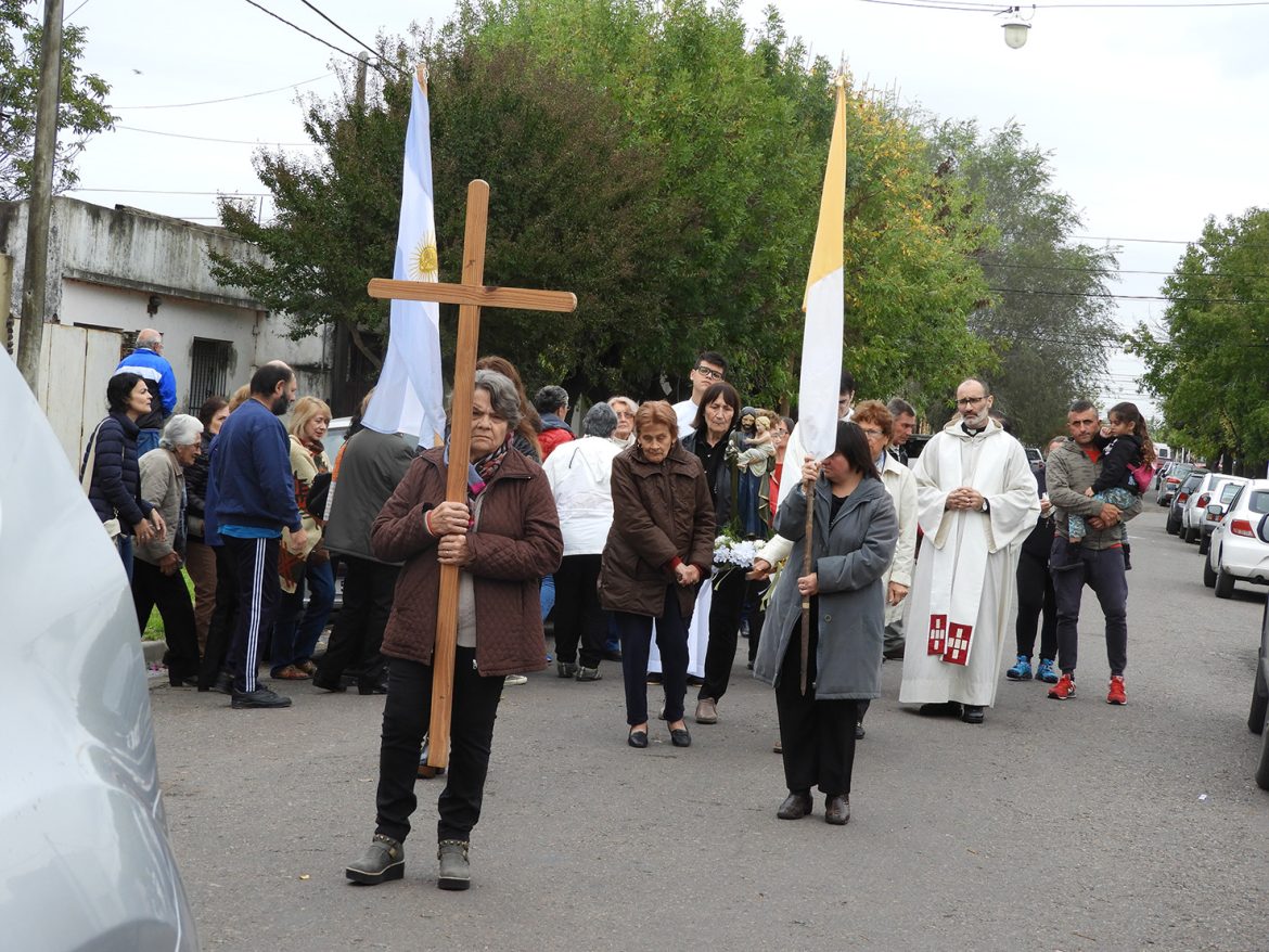 A pesar de las adversas condiciones climáticas, los fieles peregrinaron por las inmediaciones de la capilla que lleva el nombre del Santo, presididos por los sacerdotes Guillermo Gómez y Ariel Palanga. Durante el recorrido se rezaron cinco oraciones a la Virgen , de las que sin lugar la de los desocupados fue la más emotiva por marcar una realidad que tanto preocupa y ocupa a los argentinos. “Madre, estoy sin trabajo! ¡Cuántas horas van pasando en la espera!…Cuántas puertas cerradas, cuántos curriculum entregados…que pasan en vano!…Tengo las manos vacías pero la esperanza del llamado”.