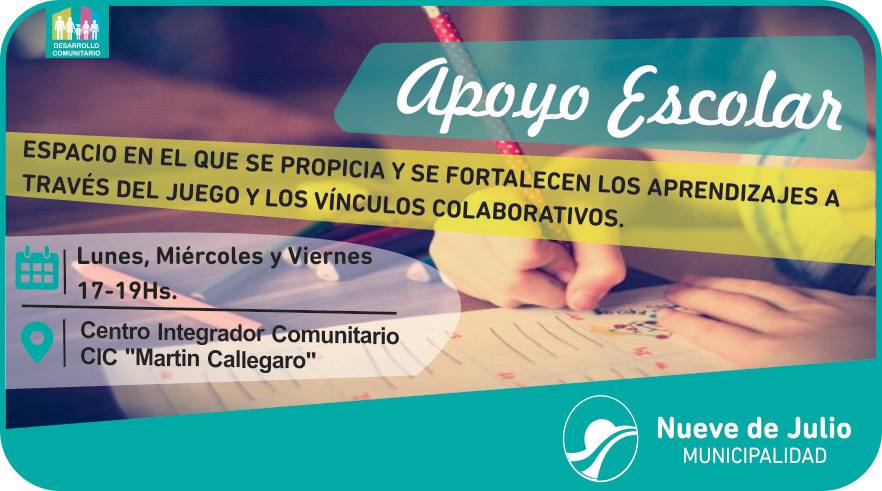 A través de la Secretaría de Desarrollo Comunitario de la Municipalidad de Nueve de Julio, todos los lunes, miércoles y viernes, a las 17 y 19 hs., se dictan talleres de apoyo escolar en el Centro Integrador Comunitario (CIC) “Martín Callegaro” de Ciudad Nueva.