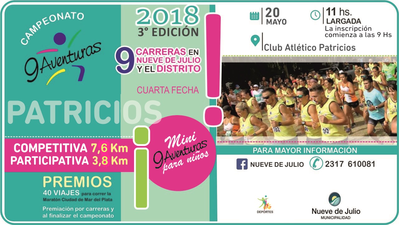 La Municipalidad de Nueve de Julio, a través de la Dirección General de Deportes, dará continuidad al campeonato “9 Aventuras”, este domingo 20 del corriente, desde las 11 hs., en la localidad de Patricios, con largada desde el Club Atlético de esta comunidad, donde podrá completarse la inscripción, desde las 9 hs.