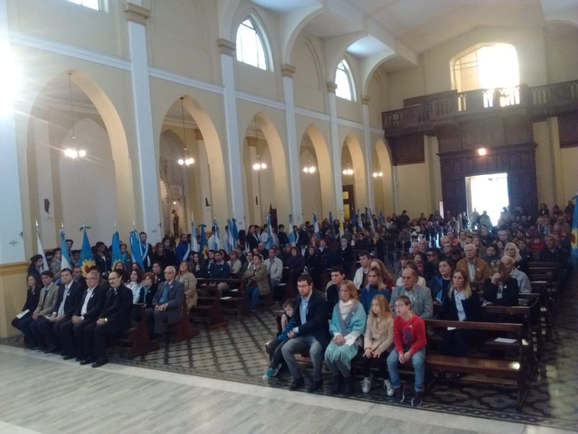 Posteriormente, serca de las 11 hs., se inició el acto con el ingreso de las Banderas de Ceremonia, la entonación de las estrofas del Himno Nacional Argentino, y se ofició una oración religiosa a cargo de la Iglesia Catedral y Evangélica.