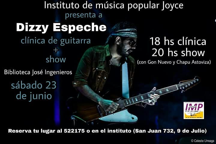 El sábado 23 de Junio, a las 18 hs., llegará a nuestra ciudad y a la “Biblioteca Popular “José Ingenieros”, el destacado guitarrista Dizzy Espeche, quien brindará una clase abierta y luego un show junto a Gon Nuevo y Chapu Astoviza.