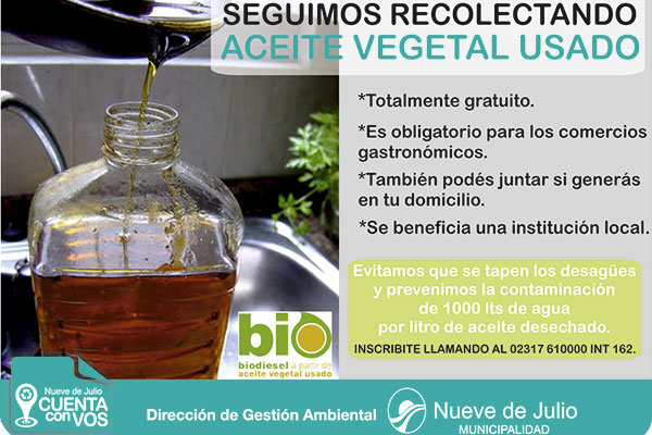 La Dirección de Gestión Ambiental de la Municipalidad de Nueve de Julio se encuentra trabajando con una empresa privada en la tarea de recolección de Aceite Vegetal Usado, con el objeto de mejorar la frecuencia de esta tarea.