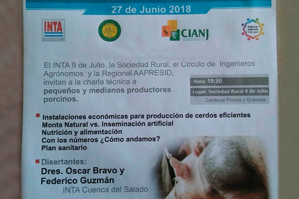 Como nuestro medio lo anticipara, en el marco del ciclo de charlas que Sociedad Rural de 9 de Julio impulsa junto a INTA 9 de Julio, Regional AAPRESID 9 de Julio y el Círculo de Ingenieros Agrónomos de 9 de Julio, el próximo miércoles 27 de junio en el Salón “11 de Marzo”, a las 19,30hs., el tema será “Producción Porcina”, donde toda la cadena de 9 de Julio y la región podrá tomar nota de distintos conceptos para producir en la actualidad, donde el consumo de carne de cerdo sigue en aumento.