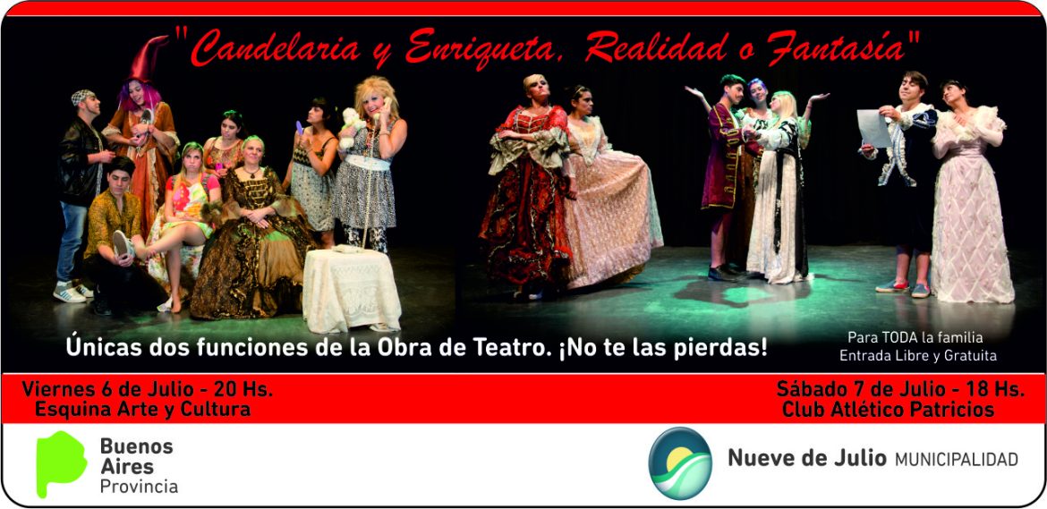 A través de la Secretaría de Cultura, Educación y Deportes de la Municipalidad de Nueve de Julio, tendrá lugar, este viernes y sábado, una doble presentación teatral, dada por la puesta en escena de la pieza “Candelaria y Enriqueta. Realidad o Fantasía”, una singular adaptación de “Cenicienta” para toda la familia, que llega a nuestra ciudad a través del Ministerio de Gestión Cultural de la Provincia de Buenos Aires, gracias al programa “El teatro a los pueblos”.
