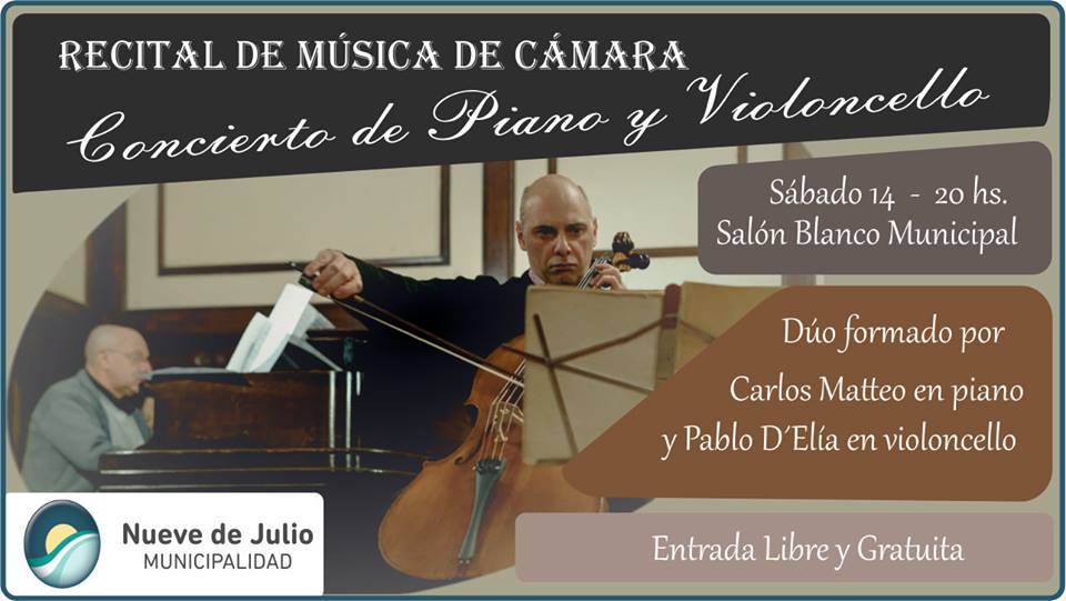 Este sábado, a las 20 hs. en el Salón Blanco Municipal y a través de la Secretaria de Cultura, Educación y Deporte, con entrada libre y gratuita, se llevará adelante un Concierto de Piano y Violoncello, interpretado por los maestros Pablo D'Elía y Carlos Matteo.
