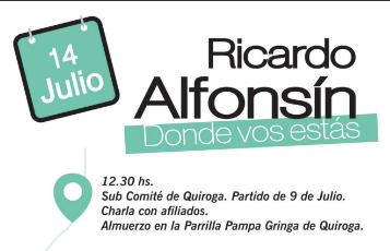 La agenda de Ricardo Alfonsín se iniciará en la localidad de Facundo Quiroga a las 12,30 hs., donde mantendrá una reunión con afiliados y compartirá un almuerzo.