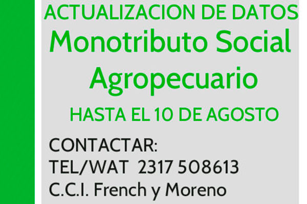 Aquellos Agricultores Familiares que actualicen sus datos continuarán con el beneficio hasta el 31 de diciembre del 2018 y a partir del 1 de enero del 2019 pasarán a ser Monotributistas Sociales. Por lo tanto, a partir del 1 de Enero de 2019 cada productor familiar deberá pagar $268,17 correspondientes al 50% del monto de la obra social por el titular, a lo que debe sumarse el mismo monto por cada familiar adherente.