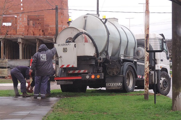 En la esquina de las avenidas Agustín Alvarez y Eva Perón, la empresa ABSA se encuentra trabajando en la desobstrucción de los desagües y cloacas, para lo cual, desarrolla la tarea un camión desestructor de la empresa Ciageser.