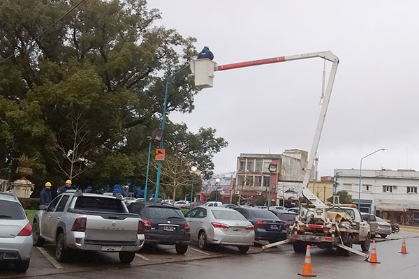 Personal de la Cooperativa Eléctrica y de Servicios “Mariano Moreno”, procede al recambio de lámparas de sodio por nuevos dispositivos led en distintos sectores del perímetro externo de Plaza General Belgrano, tal como se viene efectuando también en diferentes arterias de la ciudad, a través del convenio que rige con la Municipalidad de Nueve de Julio.