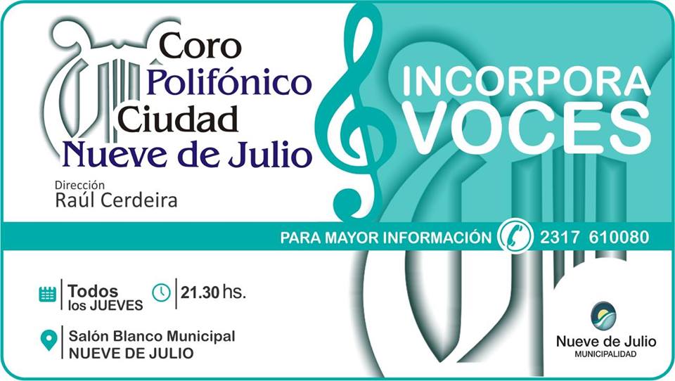 El Coro Polifónico Ciudad de Nueve de Julio incorpora voces para su temporada 2018, bajo la dirección de Raúl Cerdeira. Los ensayos se efectúan todos los jueves, a las 21,30 hs., en el Salón Blanco del Palacio Municipal.