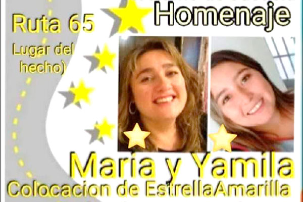 Mañana, sábado 25, a las 15 horas, en Ruta 65 y vías del ferrocarril, el grupo de familias de víctimas viales “Estrellas Amarillas”, junto a familiares y amigos de María Laura Micheli y Yamila Molina, honrarán la memoria de las jóvenes víctimas, al cumplirse 3 meses de su partida.