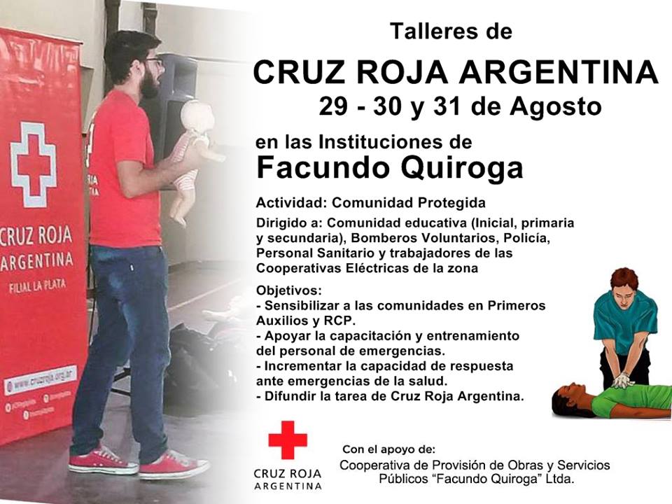 Una delegación de Cruz Roja Argentina Filial La Plata estará visitando y dictando talleres desde el próximo Miércoles 29 hasta el Viernes 31 de Agosto en las distintas instituciones de Facundo Quiroga, con una visita a la vecina localidad de La Niña.
