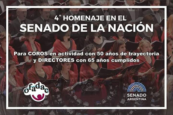 La Organización Federada Argentina de Actividades Corales (OFADAC), junto al Honorable Senado de la Nación, habrán de distinguir al Coro Polifónico Ciudad de 9 de Julio, en reconocimiento a su extensa trayectoria; en el marco de un reconocimiento a 60 coros y 20 directores de distintos puntos del país, en el marco de una importante ceremonia a realizarse el jueves 22 de noviembre, a las 11 hs., en el Salón Belgrano (anexo del H. Congreso de la Nación).