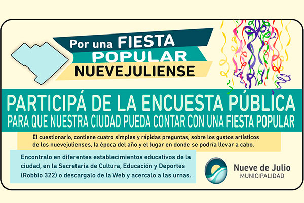 La Secretaría de Cultura, Educación y Deportes de la Municipalidad de Nueve de Julio se encuentra trabajando en una encuesta pública para que nuestra ciudad pueda contar con una fiesta popular.