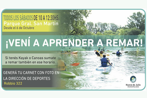 Desde mañana sábado 6, todos los sábados, de 10 a 12,30 hs., y con la coordinación de profesores de educación física y un guardavidas, la Dirección de Deportes de la Municipalidad de Nueve de Julio, vuelve a desarrollar la actividad de kayak y canoa en el Parque general San Martín. La misma comprende una escuela de remo, no siendo necesario contar con kayak, debido a que los mismos son aportados por la Dirección de Deportes.