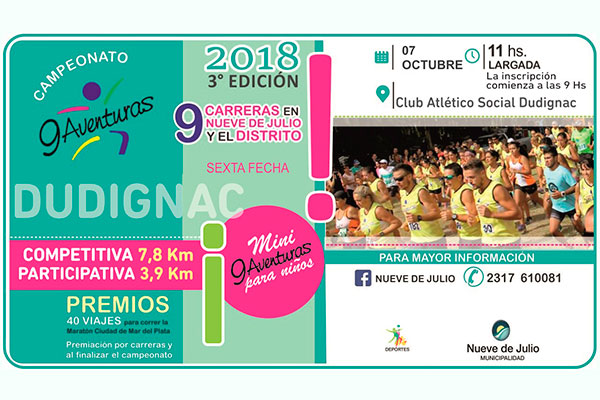 La Municipalidad de Nueve de Julio, a través de la Dirección General de Deportes, dará continuidad al campeonato “9 Aventuras”, mañana domingo 7 de octubre, desde las 11 hs., en la localidad de Dudignac, con largada desde el Club Atlético Social de esta comunidad, donde podrá completarse la inscripción, desde las 9 hs.