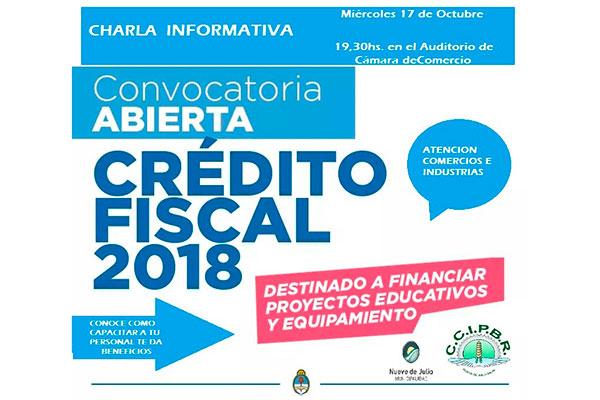La Municipalidad de Nueve de Julio, a través de la Oficina de Empleo, y en forma conjunta con la Cámara de Comercio e Industria,  llevará a cabo hoy, miércoles 17 de octubre, a las 19,30 hs., en el Salón Auditorio de la entidad empresarial, una interesante charla informativa sobre el Crédito Fiscal 2018, orientado hacia comercios e industrias en lo que refiere al financiamiento de proyectos educativos y financiamiento, lo que permitirá conocer cómo capacitar al personal entrega beneficios.