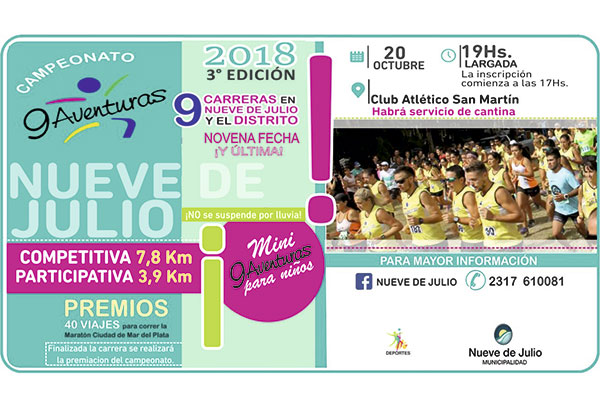 Este próximo sábado 20, desde las 19 hs., se cerrará el ciclo 2018 del campeonato “9 Aventuras”, que incluyó 9 carreras en el distrito, con la última competencia a disputarse en nuestra ciudad; que tendrá su partida desde el Club Atlético San Martín.
